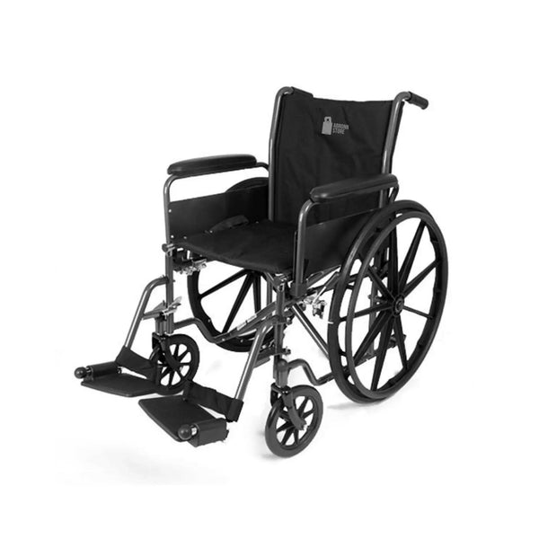 The standard wheelchair is a type of wheelchair that is designed to provide basic mobility assistance for people with mobility impairments. It typically has a metal frame with four wheels, a seat, a backrest, footrests, and armrests. The user sits in the seat, places their feet on the footrests, and uses their arms to maneuver the chair.