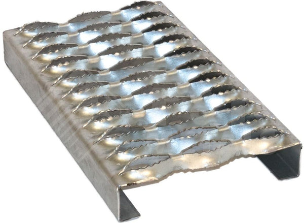 - The grating has a distinctive, repeating pattern of raised, serrated edges or "teeth".