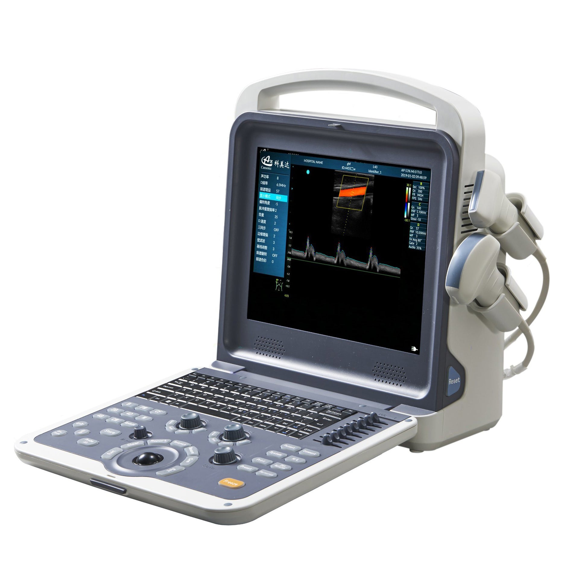 Features a dual ultrasonic scanner system that displays B-mode images alongside Doppler blood flow rate information, including blood flow direction, speed, and velocity dispersion.